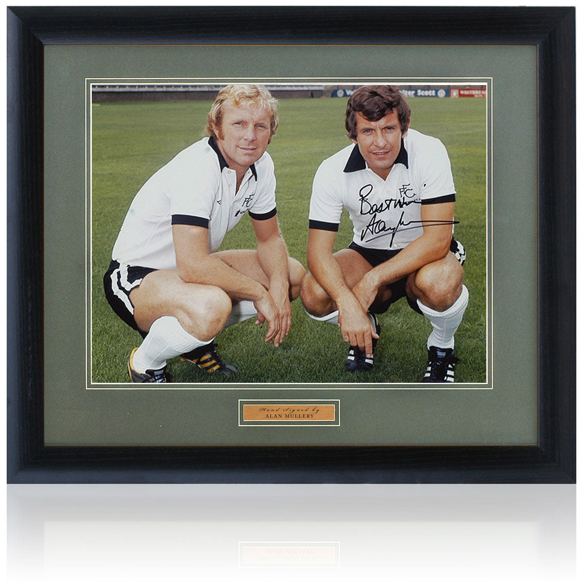 A fantastic 16x12” photograph hand-signed by Craven Cottage legend Alan Mullery, pictured alongside fellow England great Bobby Moore.