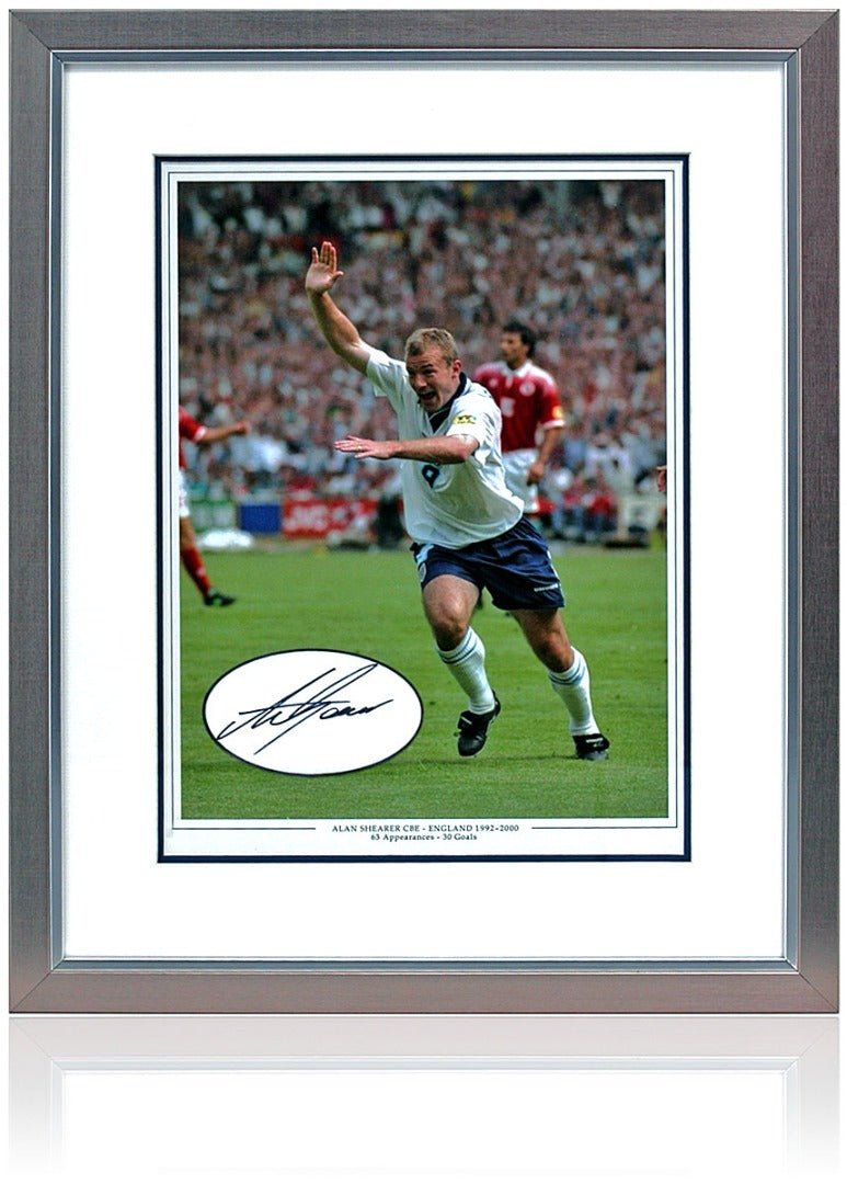 A stunning 16x12” photograph of England legend Alan Shearer celebrating his goal against Switzerland at Wembley during Euro 96, featuring a hand-signed autograph insert.