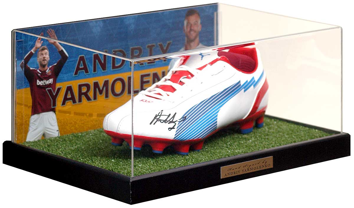 This fantastic piece comes displayed in an acrylic display case on a black wood base with a large photomontage of Yarmolenko with a Certificate of Authenticity issued by AFTAL members The BritishSportsMuseum.com