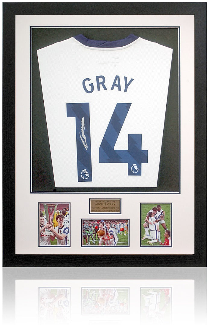 This fantastic piece of sporting memorabilia features a Tottenham Hotspur home shirt, hand signed by the Europa League final winner, Archie Gray.