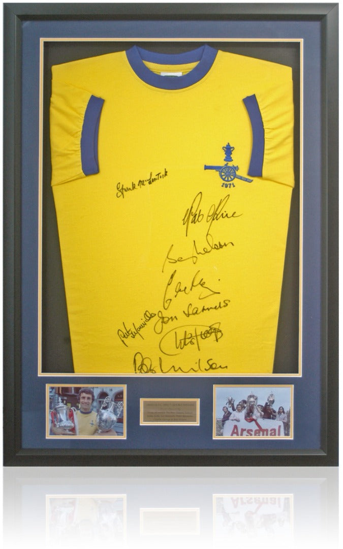 Fantastic replica vintage Arsenal shirt hand-signed by 8 members of the iconic Arsenal squad who did the 1970/71 domestic double winning the First Division title and the FA Cup.