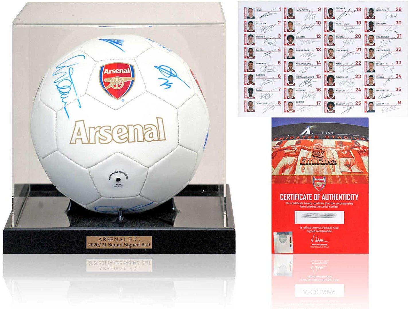 This fantastic piece of memorabilia comes in an acrylic display case with a Certificate of Authenticity issued by Arsenal FC and an autograph identification sheet.