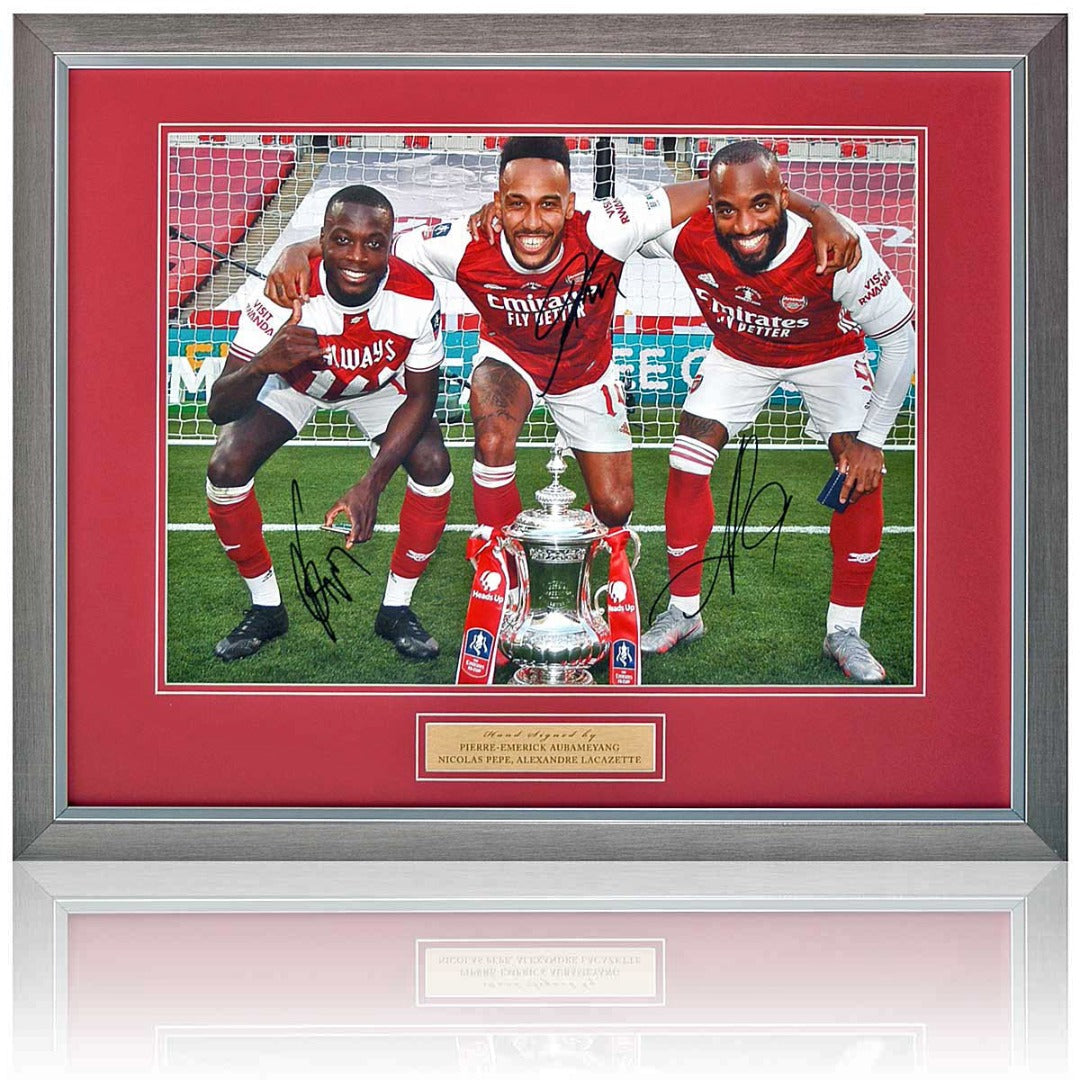 Fantastic 16x12" photograph hand signed by Pierre-Emerick Aubameyang, Nicolas Pépé & Alex Lacazette posing with the 2020 FA Cup trophy.