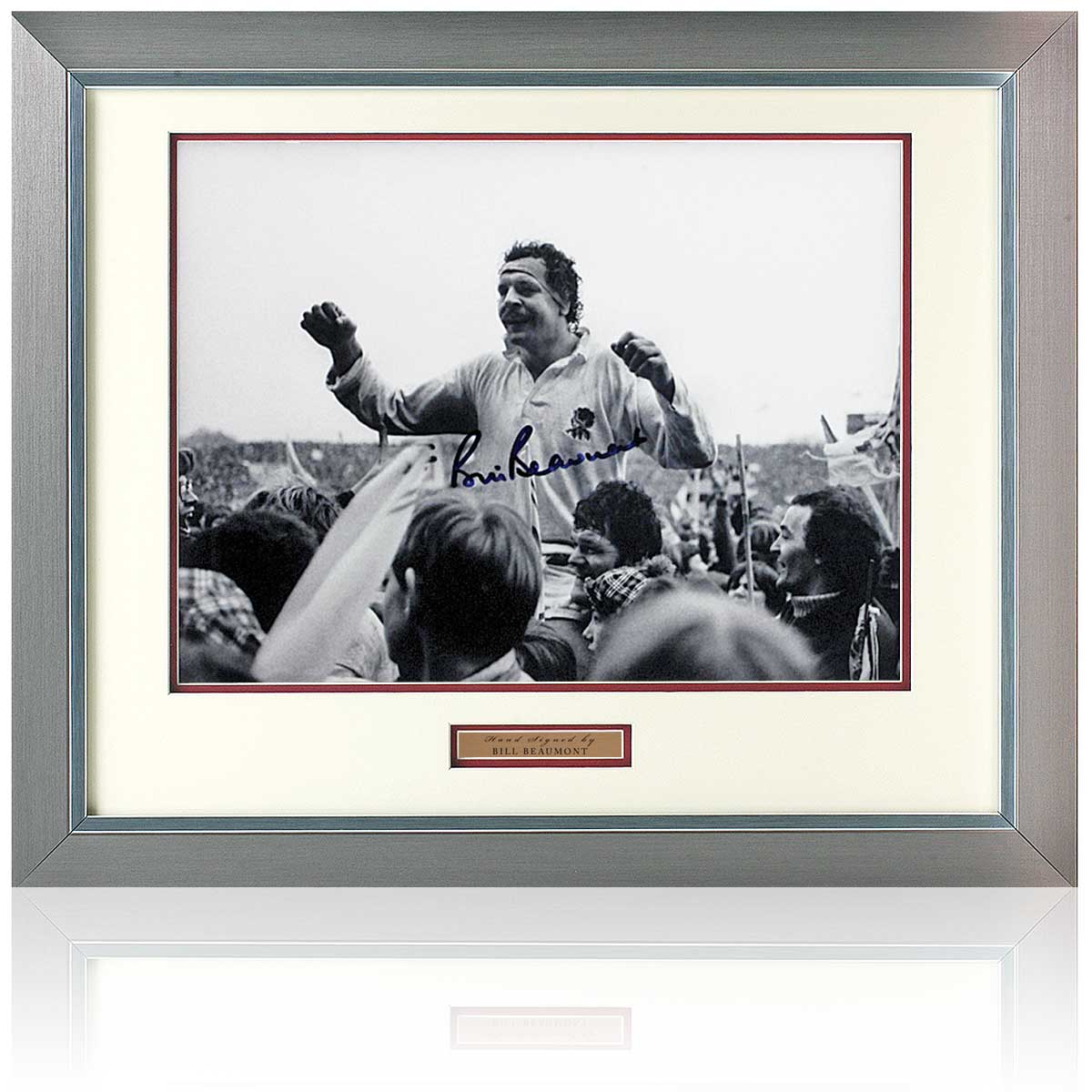 Fantastic 16x12" photograph hand signed by England rugby legend, Bill Beaumont, pictured being carried off the pitch after winning the 1980 Grand Slam against fierce rivals Scotland.