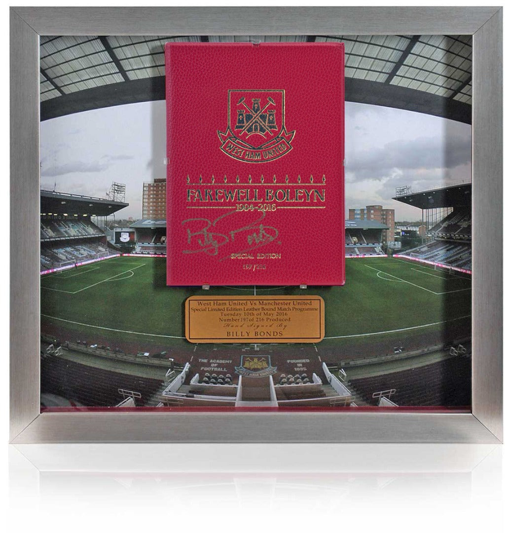Leather-bound Farewell Boleyn 1904-2016 match day programme from Final ever game at the Boleyn ground Upton Park Vs Manchester United 10.5.16. One of only 216 produced, this rare hardcover leather-bound programme is individually numbered and hand-signed by club legend Billy Bonds, MBE. 197/216