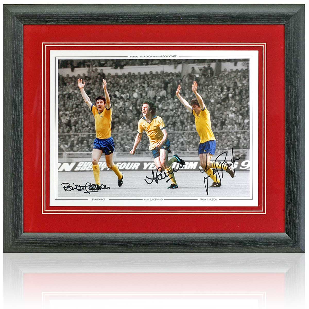 Fantastic 16×12″ photographic montage of Brian Talbot, Alan Sunderland, and Frank Stapleton celebrating their goals scored in the 1979 FA Cup final victory.