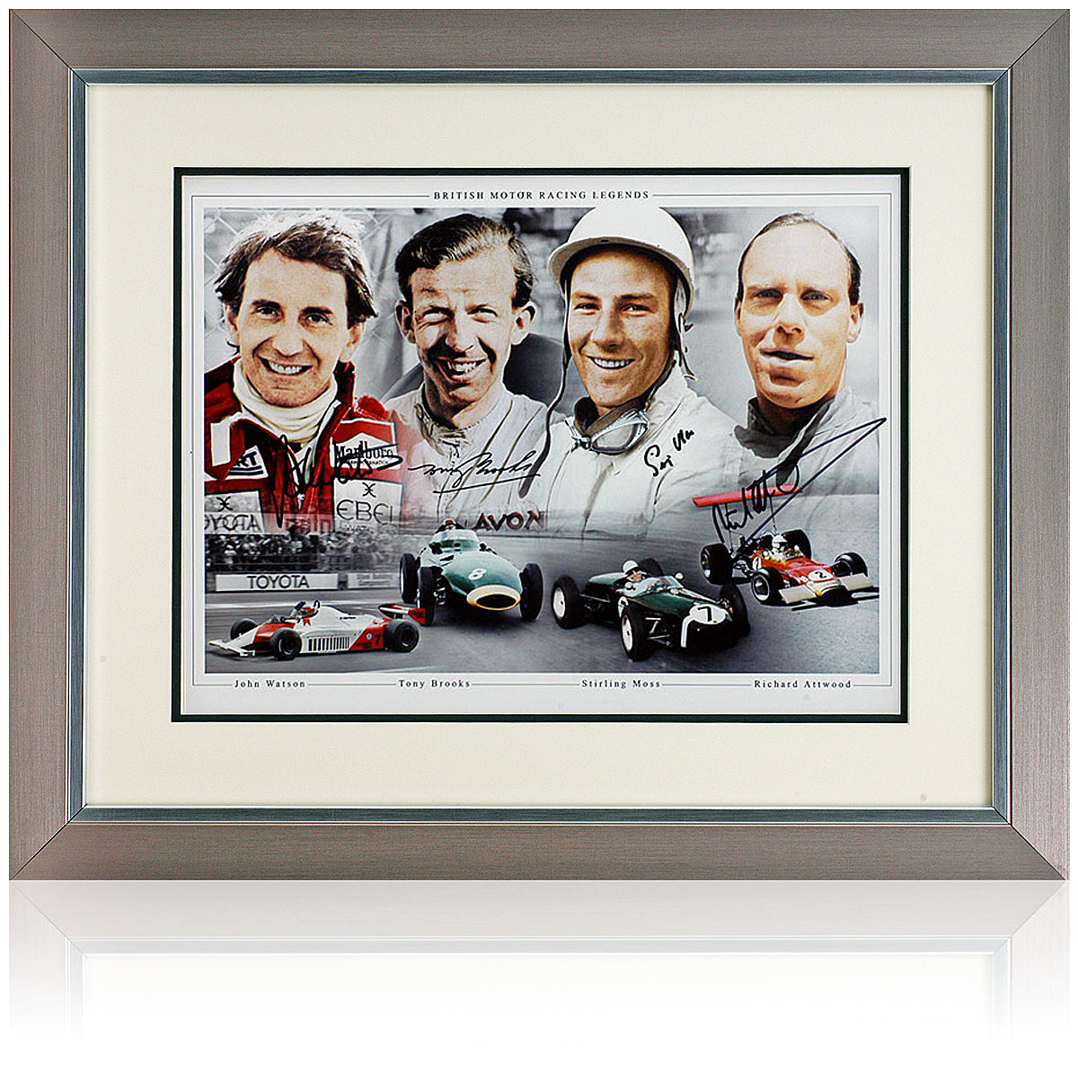 Hand-signed by Sir Stirling Moss, Tony Brooks, John Watson, and Richard Attwood.