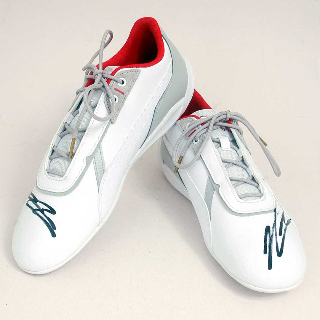 A fantastic pair of official white Ferrari trainers, each personally hand-signed by Formula 1 superstar Charles Leclerc. A rare and highly collectible piece of F1 memorabilia from one of the sport’s most exciting drivers.