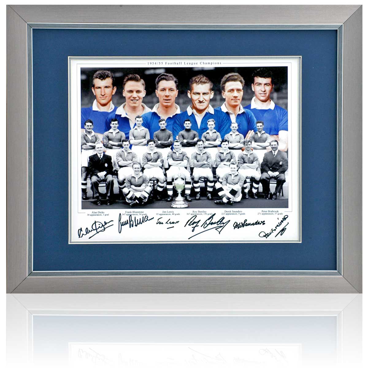 22x18 Inch Framed Presentation features a 16x12'' hand signed Photomontage of Chelsea legendary 1955 League Champions featuring Roy Bentley, Derek Saunders, Jim Lewis, Frank Blunstone, Peter Brabrook and Alan Dicks.