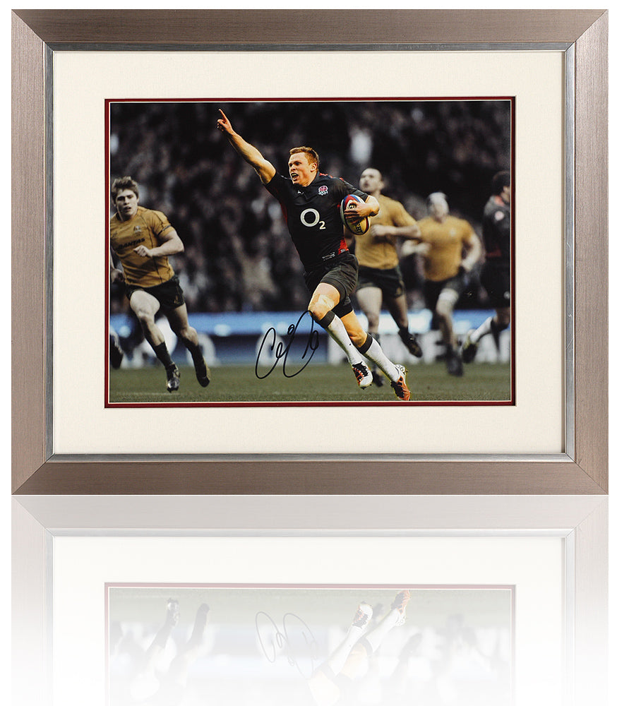 16 x 12″ photograph of Chris Ashton celebrating scoring a try against Australia, hand signed by England’s scoring machine, mounted on white & red in a 23 x 19″ pewter frame. This item comes with a Certificate of Authenticity. issued by AFTAL members British Sports Museum with photo of Ashton singing the photo.