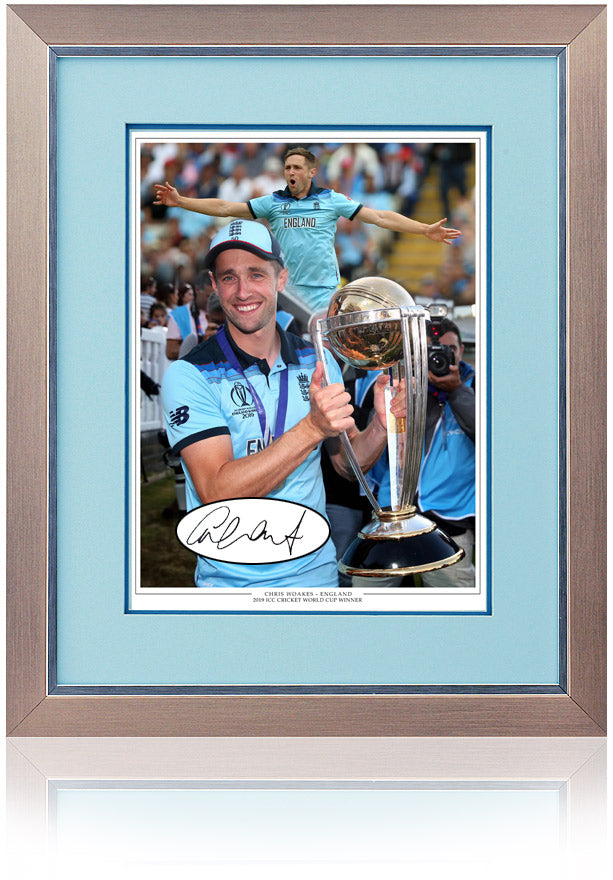 Fantastic hand-signed montage of England Cricketing hero Chris Woakes celebrating winning the 2019 Cricket World Cup.