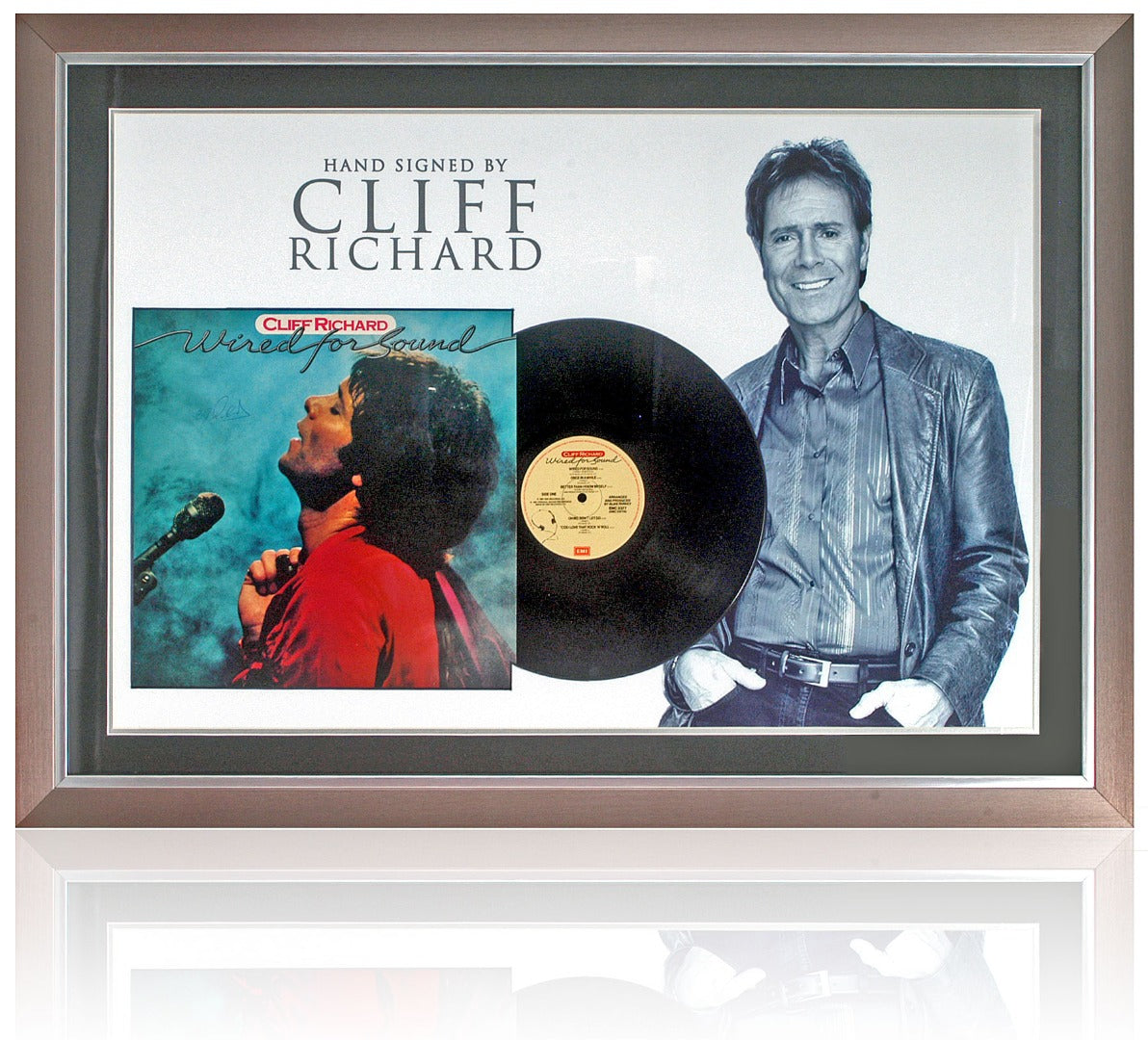 Fantastic presentation of British music, singing, and performing legend, Sir Cliff Richard OBE. This incredible display comes with a "Wired for Sound" Vinyl sleeve hand-signed by Sir Cliff presented in a large photograph of the musical icon.