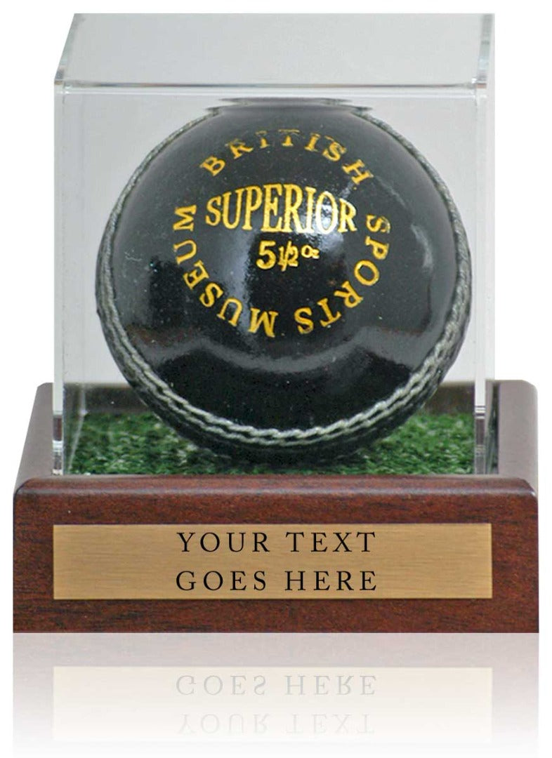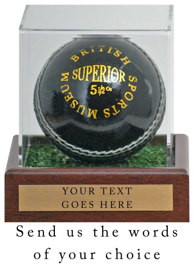 Cricket Ball Display case on a mahogany base with astroturf inner and brass plaque printed with words of your choice. Please note this item does not come with the cricket ball in the photograph.