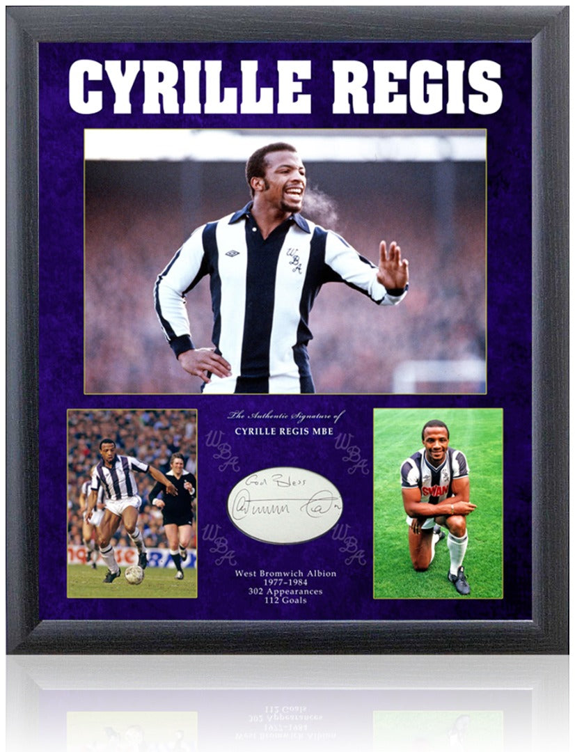 A stunning piece of football memorabilia featuring the authentic signature of West Bromwich Albion legend Cyrille Regis, hand-signed and displayed in a large photographic montage celebrating his remarkable career.