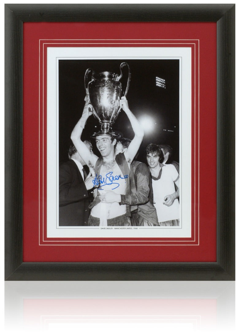 Fantastic 16x12" photograph hand signed by Manchester United legend, David Sadler, pictured lifting the 1968 European Cup after beating Benfica 4-1 in a Wembley final.