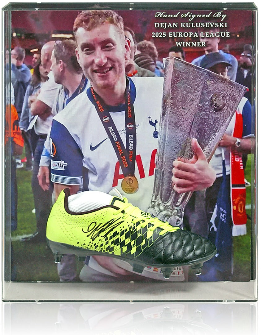 A truly superb presentation of a football boot hand signed by Tottenham Hotspur Europa League 2025 winner, Dejan Kulusevski.