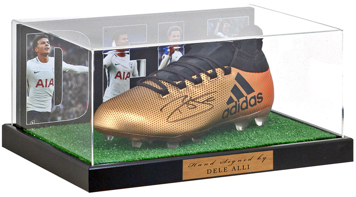 A superb piece of modern football memorabilia featuring an authentic hand-signed boot by Spurs icon Dele Alli. This incredible collectible is beautifully displayed in an acrylic display case on an astroturfed black wood base with a custom graphic backboard, measuring 36x25x17cm.