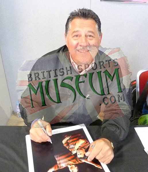 This amazing piece comes mounted in grey art board in a black wood frame measuring 23x19". The item comes with a photo-proof Certificate Of Authenticity issued by AFTAL members The BritishSportsMuseum.com