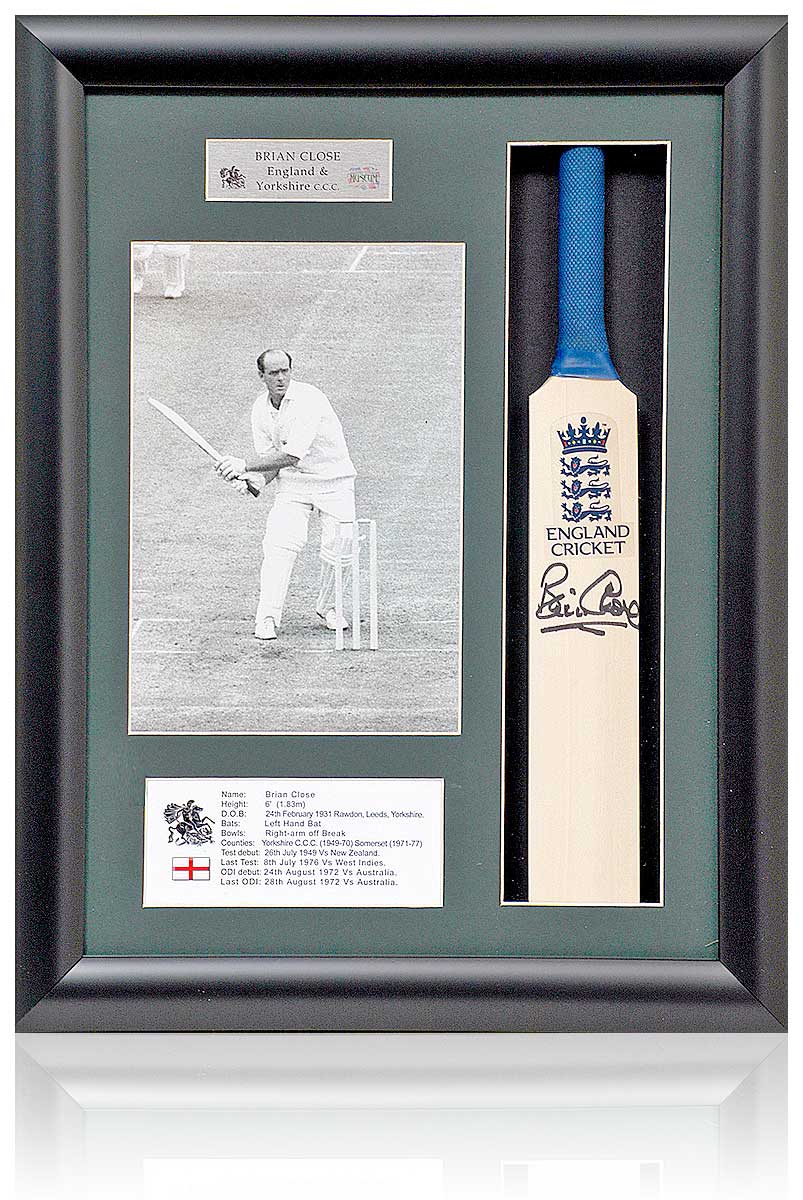 A truly superb framed presentation of England and Yorkshire CCC cricketing legend, Brian Close, which features a hand-signed mini bat mounted with an inset photograph of Close, Silver Name Plague, and info sheet.