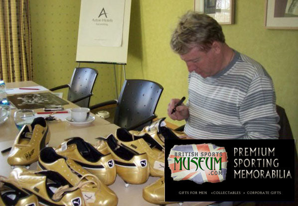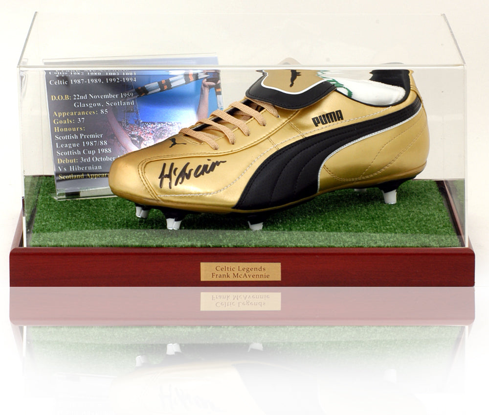 Beautifully presented in an acrylic display case with AstroTurf base, this Gold colour Puma Football boot has been hand-signed by Celtic legend Frank McAvennie. This Stunning item comes with an AFTAL COA with photo of Frank signing the boot.