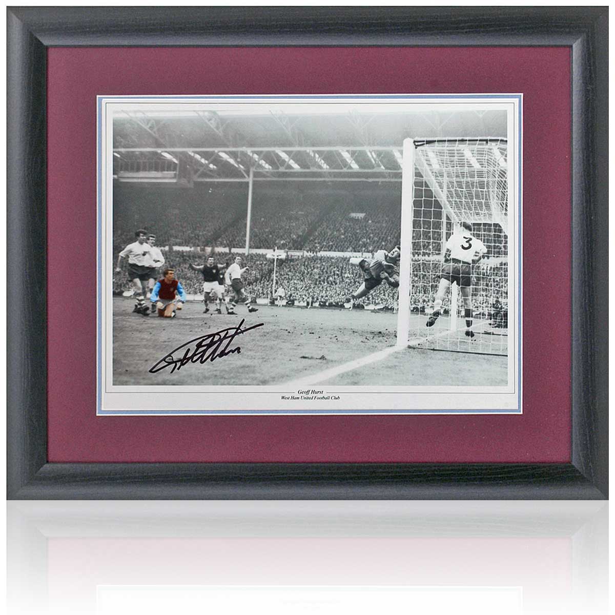 This fantastic comes double mounted in claret and blue artboard in a black wood gallery frame measuring 23x19 inches. This item comes with a Certificate of Authenticity issued by AFTAL members British Sports Museum, which includes photo proof of Hurst signing the print.