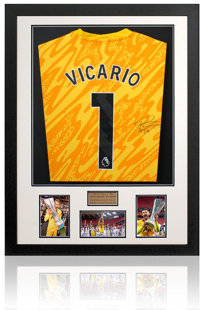 This fantastic piece of sporting memorabilia features a Tottenham Hotspur goalkeepers shirt, hand signed by the Europa League final winner, Guglielmo Vicario.
