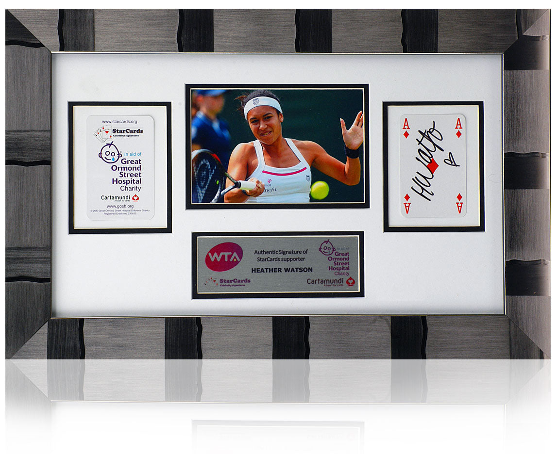 Fantastic presentation of British tennis pro-Heather Watson which includes a WTA GOSH Ace of Diamonds playing card hand-signed Heather, 6x4" photograph, and a silver plaque. Part of a rare collection especially signed to raise funds for the world-famous Great Ormond Street Hospital Charity. Comes double mounted in white and black artboard in a frame measuring 18x12 inches with a Certificate Of Authenticity issued by AFTAL members The British Sports Museum.