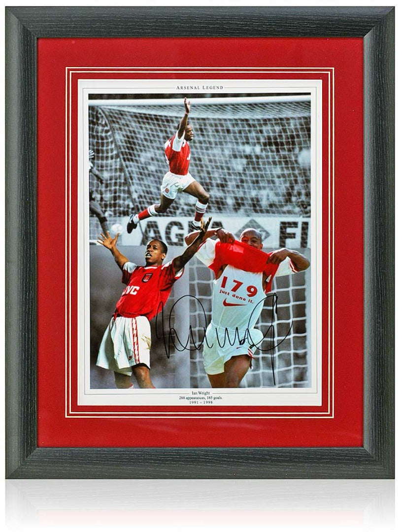 Fantastic 16x12" photographic montage hand-signed by Arsenal legend Ian Wright. This outstanding piece of sporting memorabilia features a bold, clear signature and comes mounted in red mount board within a black wood gallery frame measuring 23x19 inches.