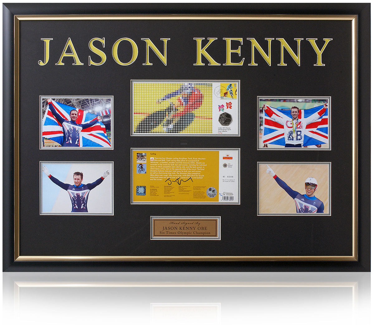 Stunning presentation of 6-time Olympic gold medal-winning legend, Jason Kenny. This beautiful display features a 2012 Royal Mint 50p coin cover hand-signed by Jason surrounded by images of him competing for England.