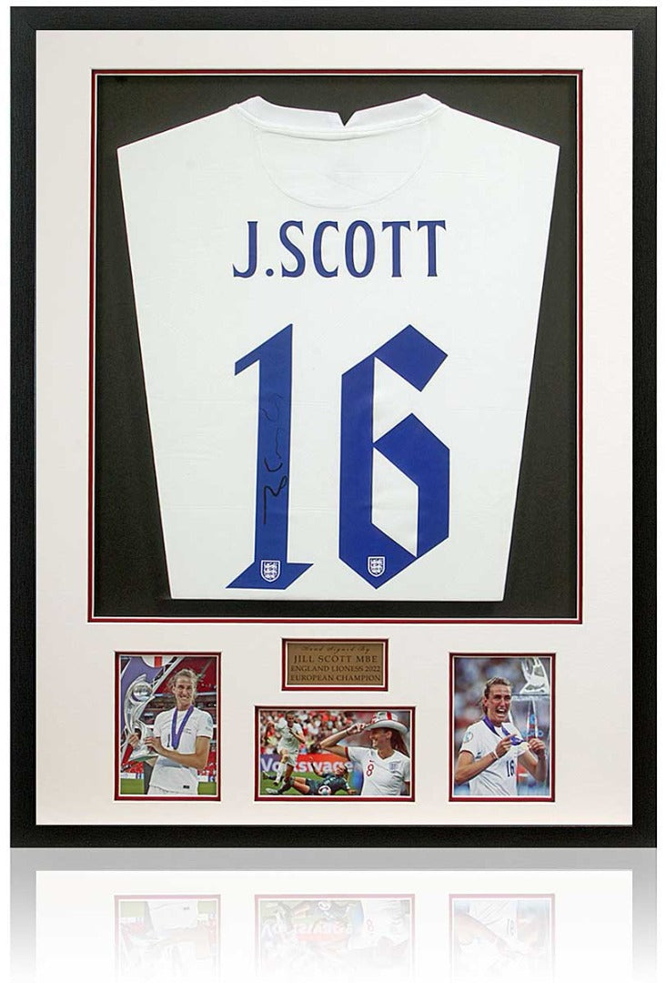 Own a piece of Lionesses history with this fantastic England football shirt hand-signed by Jill Scott, one of the most iconic players in women’s football and a key figure in England’s Euro 2022 triumph.