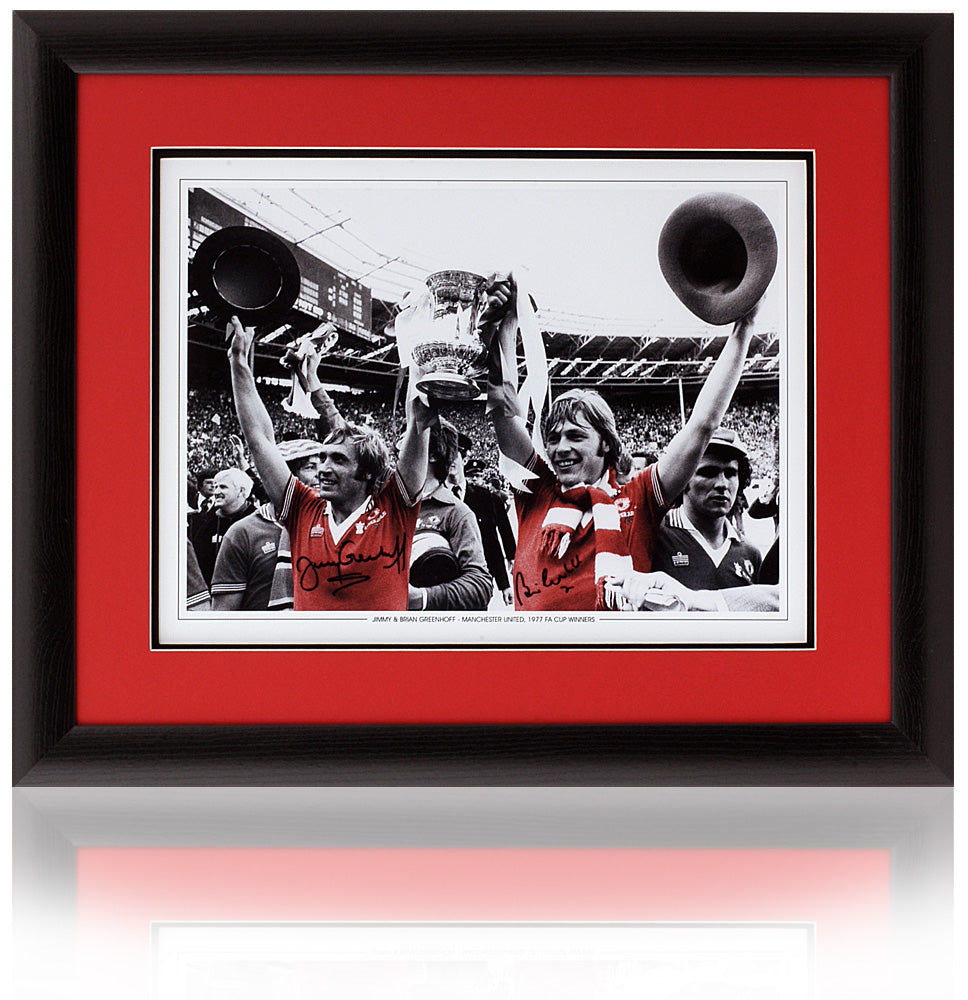 Fantastic 16x12" photograph hand signed by Manchester United legends, Jimmy and Brian Greenhoff, pictured celebrating after winning the 1977 FA Cup.