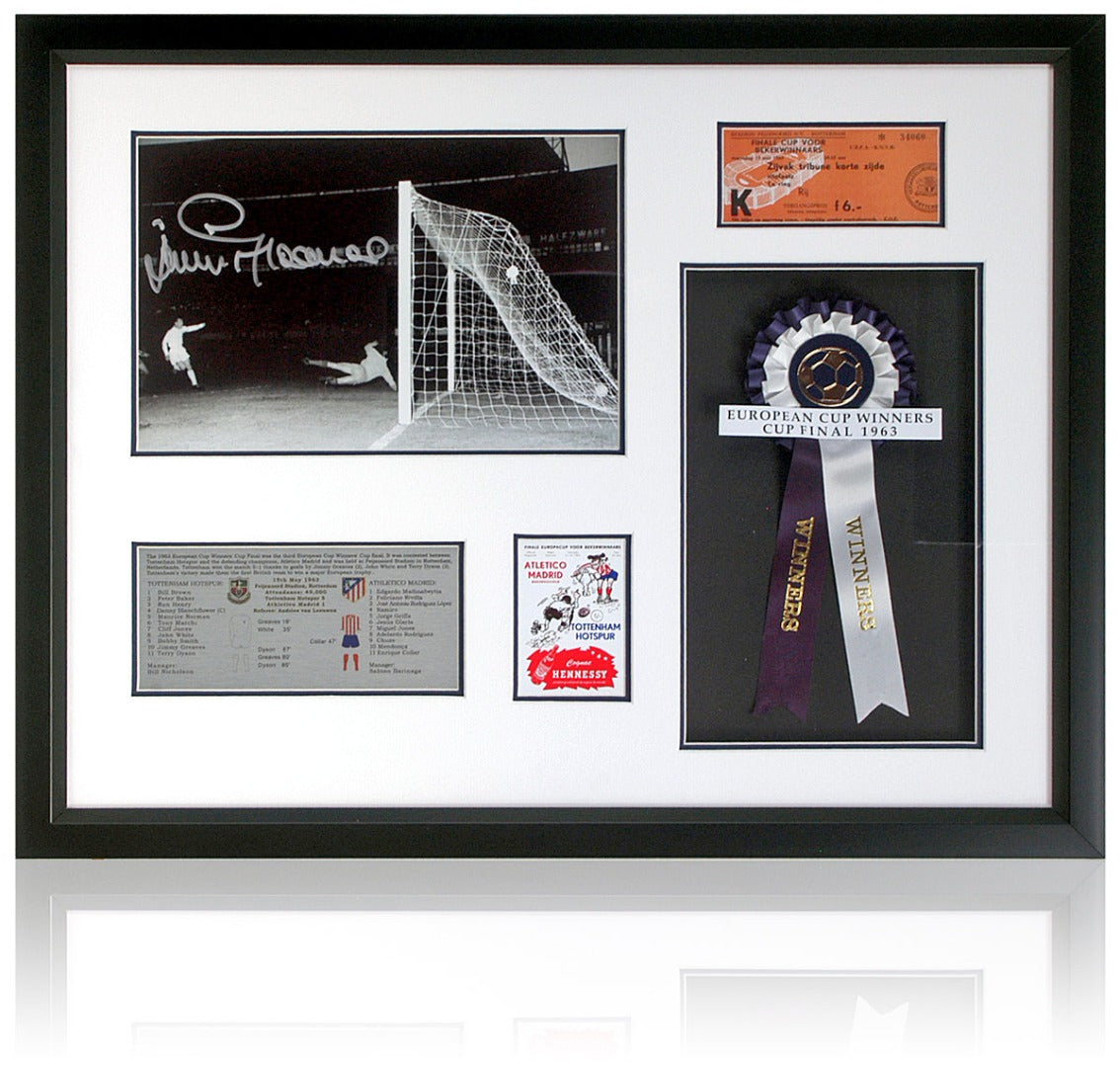 A fantastic large presentation of Spurs' 1963 European Cup Winners' Cup 5-1 victory over Athletico Madrid. This incredible piece features a hand-signed photograph of Jimmy Greaves scoring one of his two goals, a silver match facts plaque, a rosette, a replica match ticket, and mini print of the programme front cover. The item comes double mounted in white and blue artboards in a deep black frame with a Certificate Of Authenticity issued by AFTAL members TheBritishSportsMuseum.com