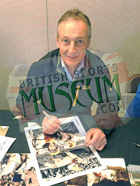 This stunning piece comes mounted in grey gallery artboard in a black wood frame measuring 23x19". This item comes with a Certificate of Authenticity issued by AFTAL members British Sports Museum which includes photo proof of Dunwoody signing the print.