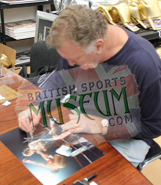 This brilliant piece of sporting memorabilia comes presented in a grey v-grove mountboard in a black wood gallery frame measuring 23x19 inches. The item comes with a photo-proof Certificate Of Authenticity issued by AFTAL Company British Sports Museum