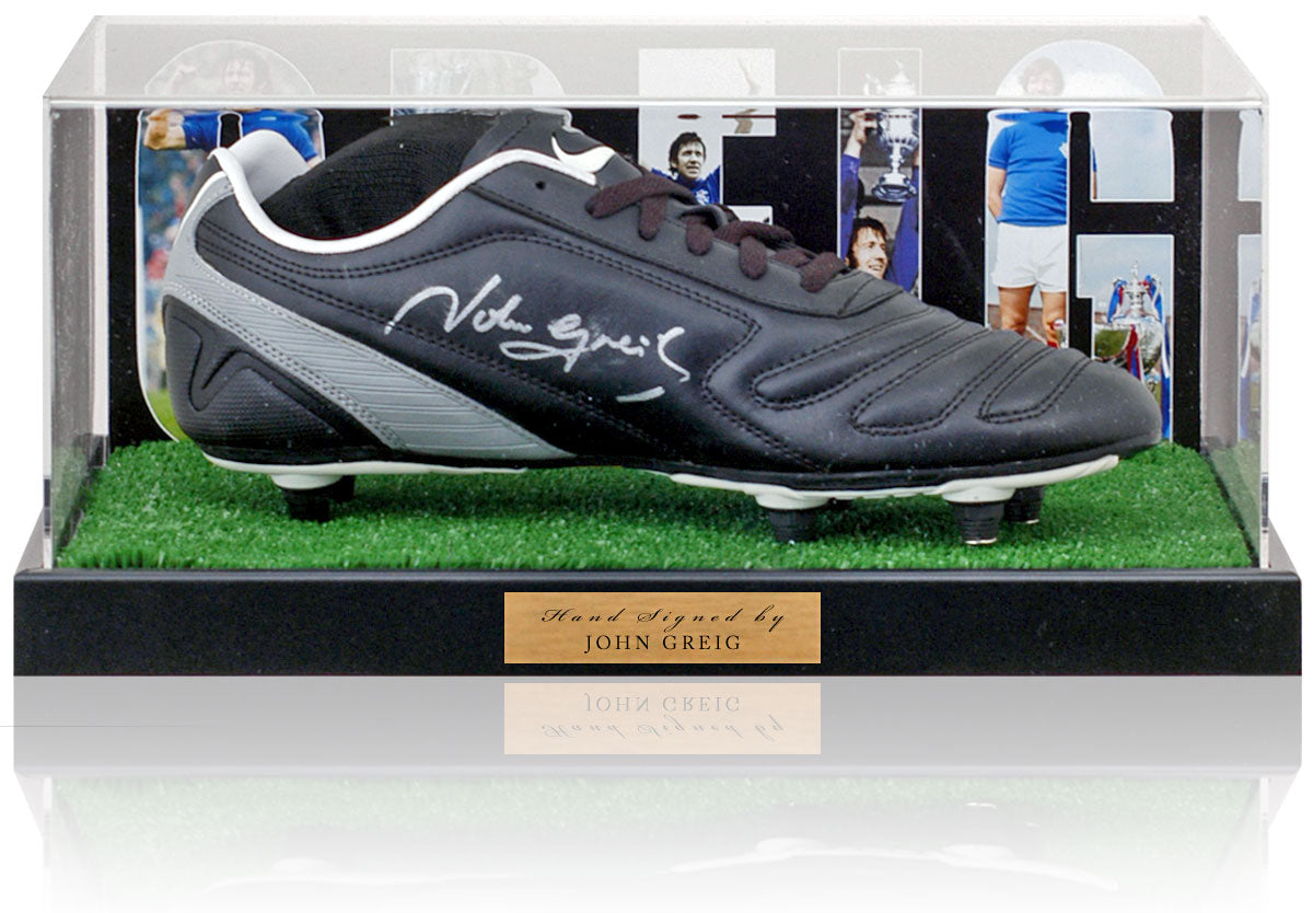 Fantastic football boot presentation hand signed by Rangers legend, John Greig.