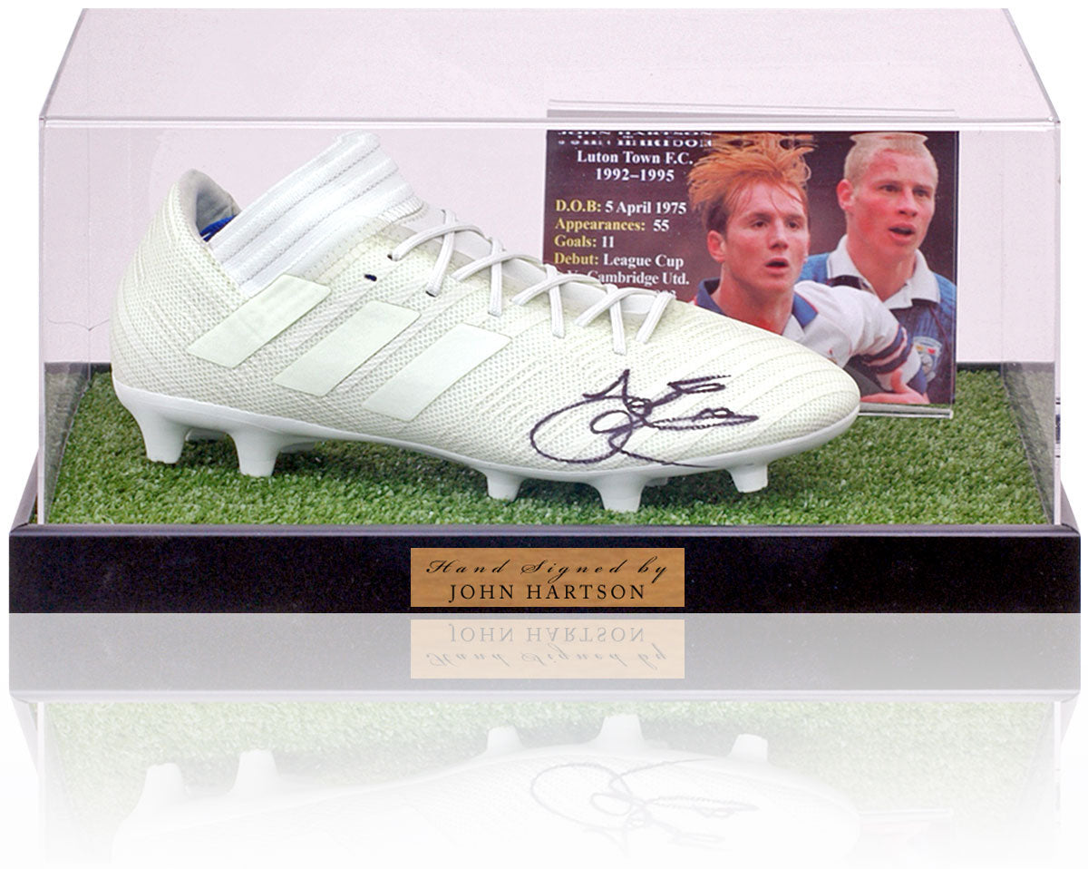 Fantastic football boot hand signed by Luton Town legend, John Hartson, which comes beautifully presented in an acrylic display case.