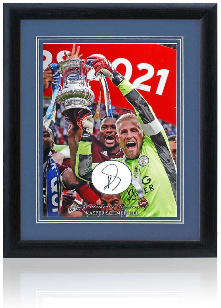 Fantastic hand-signed signature of Leicester City already club legend, Kasper Schmeichel, inserted in a wonderful photo of Schmeichel lifting the 2021 FA Cup.