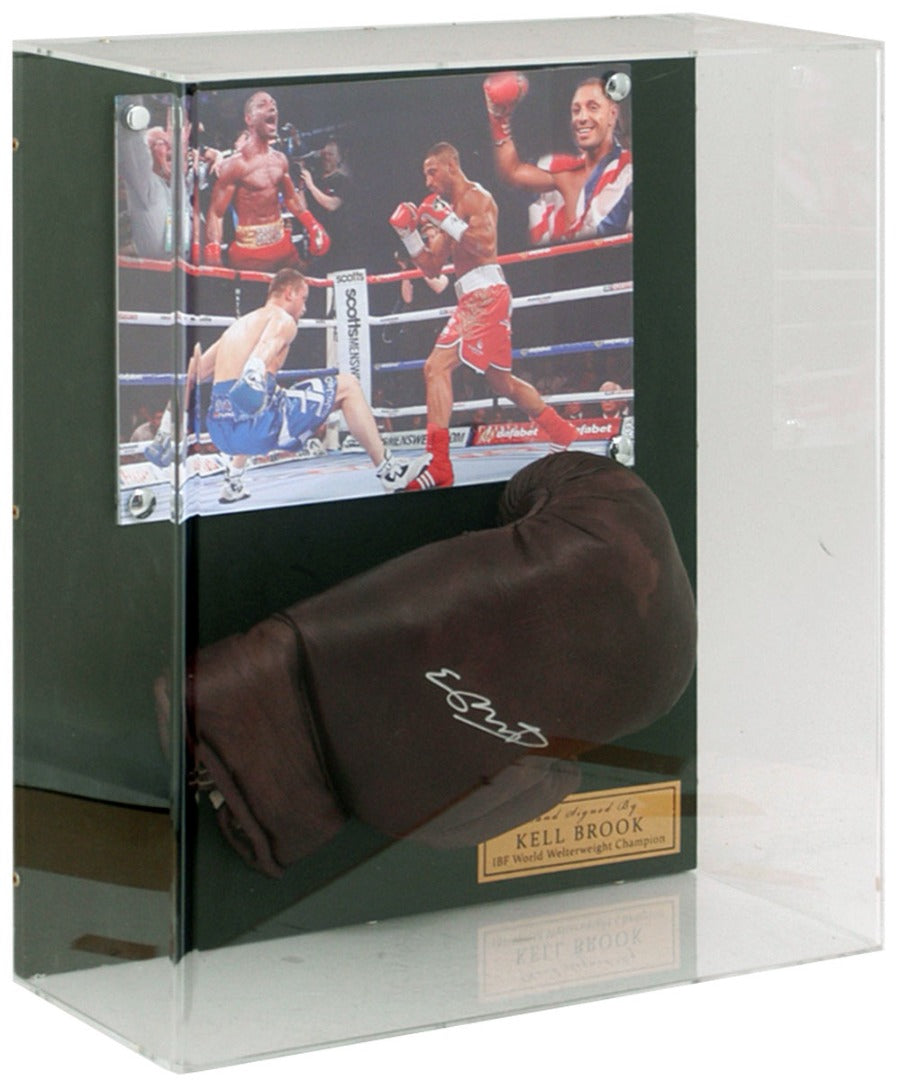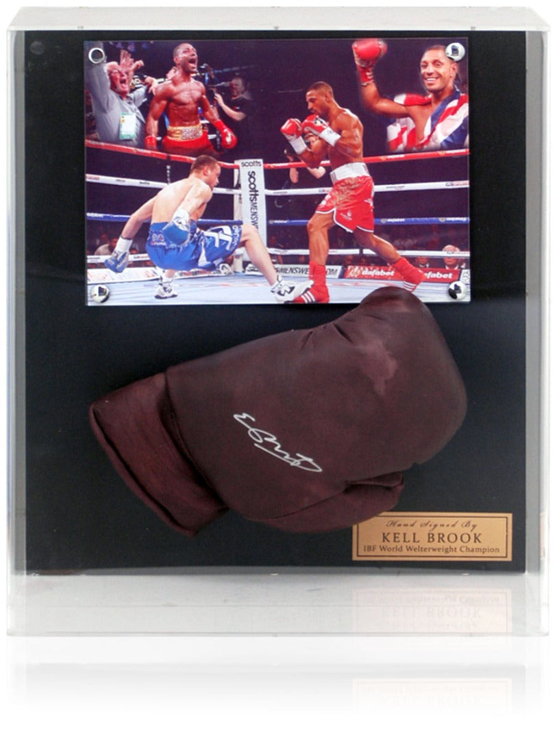 A fantastic large presentation of British boxing great, Kell Brook, which includes a 10x8" photomontage of Brook winning the IBF World Welterweight Championship and a hand-signed boxing glove. This great piece comes displayed in an acrylic case with a photo-proof Certificate of Authenticity issued by AFTAL members The BritishSportsMuseum.com.