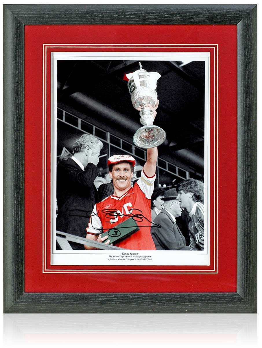 Fantastic 16x12" photograph hand signed by Arsenal legend, Kenny Sansom, pictured lifting the 1987 League Cup trophy.