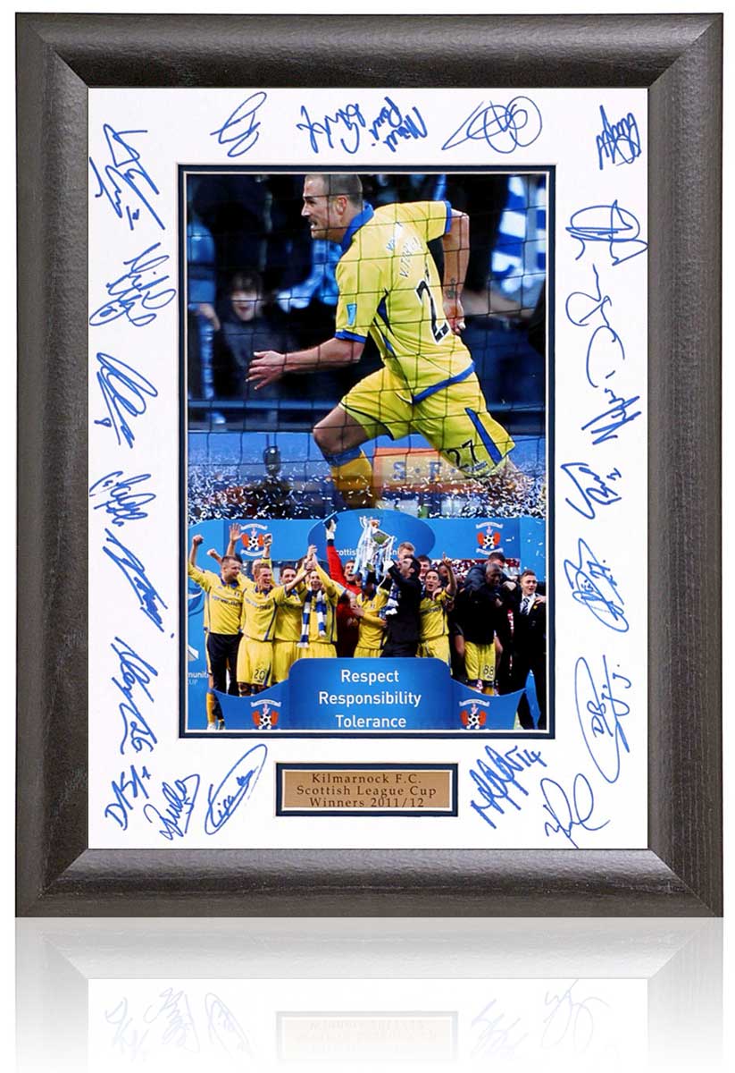 Fantastic presentation of Kilmarnock's historic 2012 Scottish Communities 1-0 League Cup Final win over Celtic. This great piece includes a mountboard hand signed by the squad with a photo montage of Van Turnhout celebrating the winning goal and the squad lifting the cup.