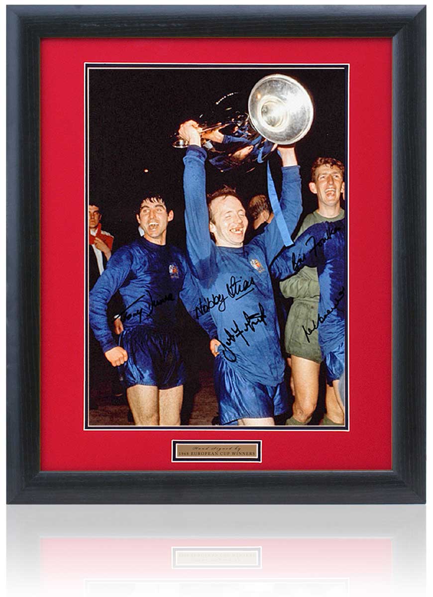 Fantastic 16x12" colourised photograph of Manchester United lifting the 1968 European Cup after beating Benfica 4-1 in the final at Wembley Stadium, hand signed by 5 legends.