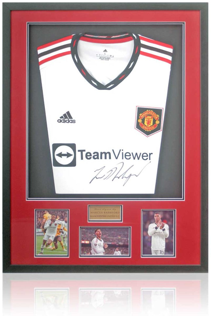 Fantastic Manchester United 2022/23 away shirt hand-signed by England superstar, Marcus Rashford.