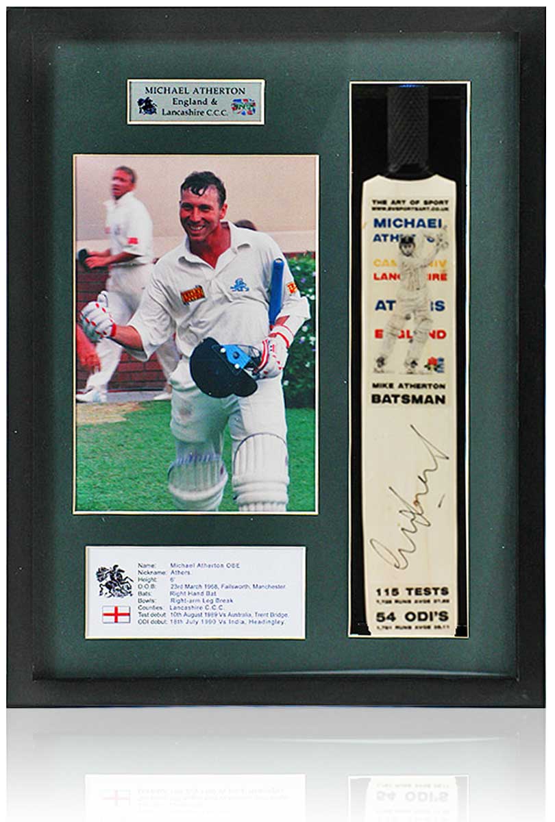 This truly superb framed presentation of former England cricket Captain Michael Atherton featuring a hand-signed mini cricket bat with an inset photograph of Atherton after saving the Wanderers Test Match in South Africa in 1995, Silver Name Plague, and player profile.