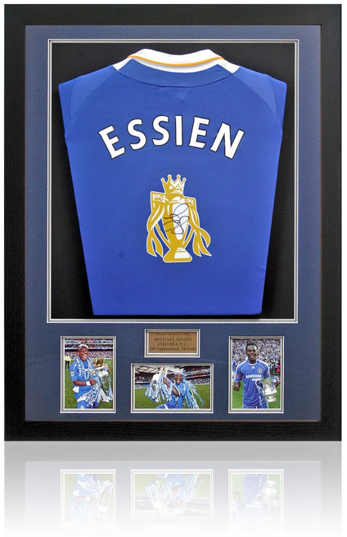 This fantastic piece of sporting memorabilia features a Premier League trophy Chelsea F.C. home shirt, hand signed by the legendary Michael Essien.