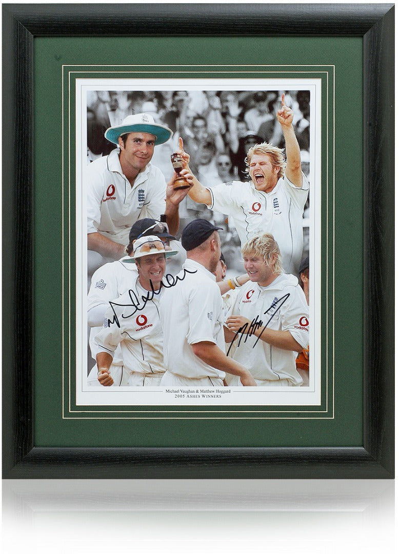 Beautifully presented 16x12” montage of England’s 2005 Ashes winners Michael Vaughn OBE and Mathew Hoggard MBE. This stunning piece comes hand signed by both English cricket legends and mounted in a gallery-grade black wood frame measuring 23x19 inches.