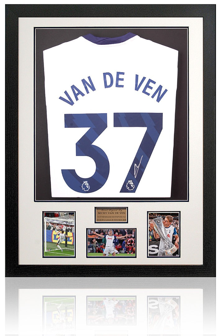 This fantastic piece of sporting memorabilia features a Tottenham Hotspur home shirt, hand signed by the Europa League final winner, Micky van de Ven.