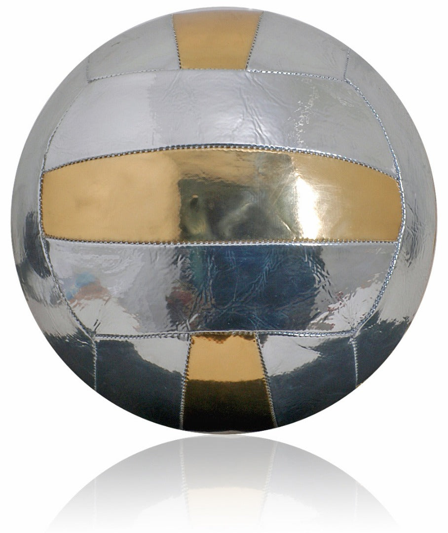 Introducing a beautiful 18-panel PU leather-look volleyball in stunning metallic silver and gold.