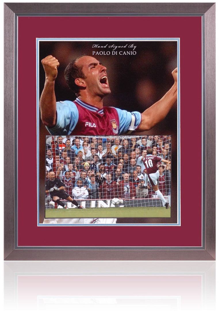 A superb presentation of West Ham United legend, Paolo Di Canio, which includes a hand-signed 12x8" photograph displayed in a fantastic photograph. This great piece comes double recess mounted in claret and blue artboard in a 23x19" pewter gallery frame. Item comes with Certificate Of Authenticity issued by AFTAL members The BritishSportsMuseum.com