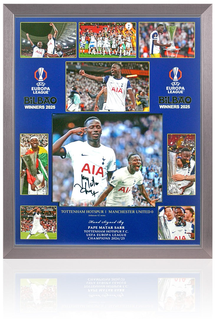 A fantastic piece of sporting memorabilia featuring a large photo-montage of Tottenham Hotspur's 2025 Europa League victory, hand signed by Pape Matar Sarr.