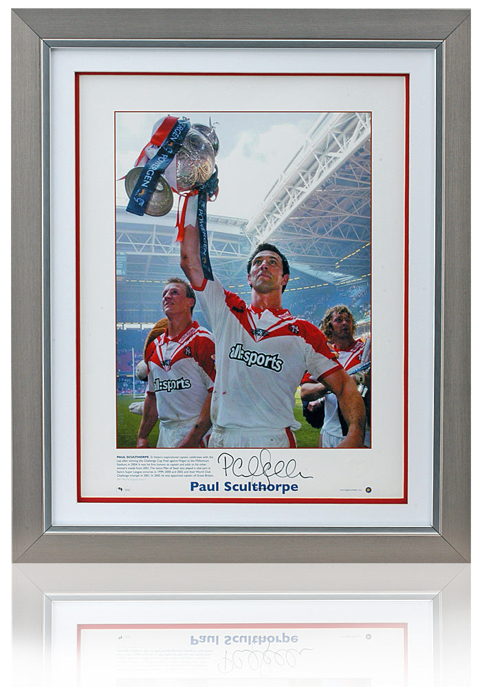 Beautifully presented photograph hand signed by former St Helen’s Captain, Paul Sculthorpe, pictured as he celebrates winning the 2004 Challenge Cup Final against Wigan at the Millennium Stadium